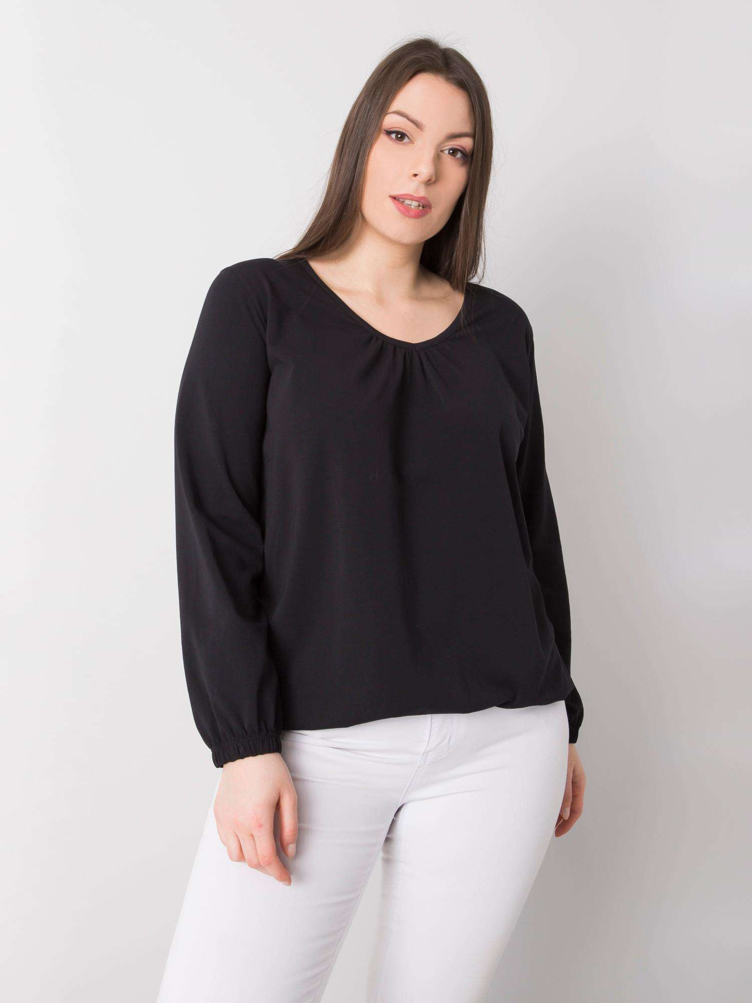 Czarna bluzka o długim rękawie Hailey to idealny wybór, jeśli chcesz wyglądać stylowo i szykownie. Ten fason doskonale dopasuje się do figur plus size i sprawi, że będziesz prezentować się z klasą. Bluzka została wykonana z miękkiej i wytrzymałej tkaniny, a jej skład to 90% bawełna i 10% elastanu. Prosty krój tej bluzy i długi rękaw wspaniale podkreślą Twoją sylwetkę, a przy okazji pozwolą Ci poczuć się swobodnie i komfortowo. Bluzka na dole i na rękawach zakończona gumką. Dekolt z lekkim marszczeniem w serek .
