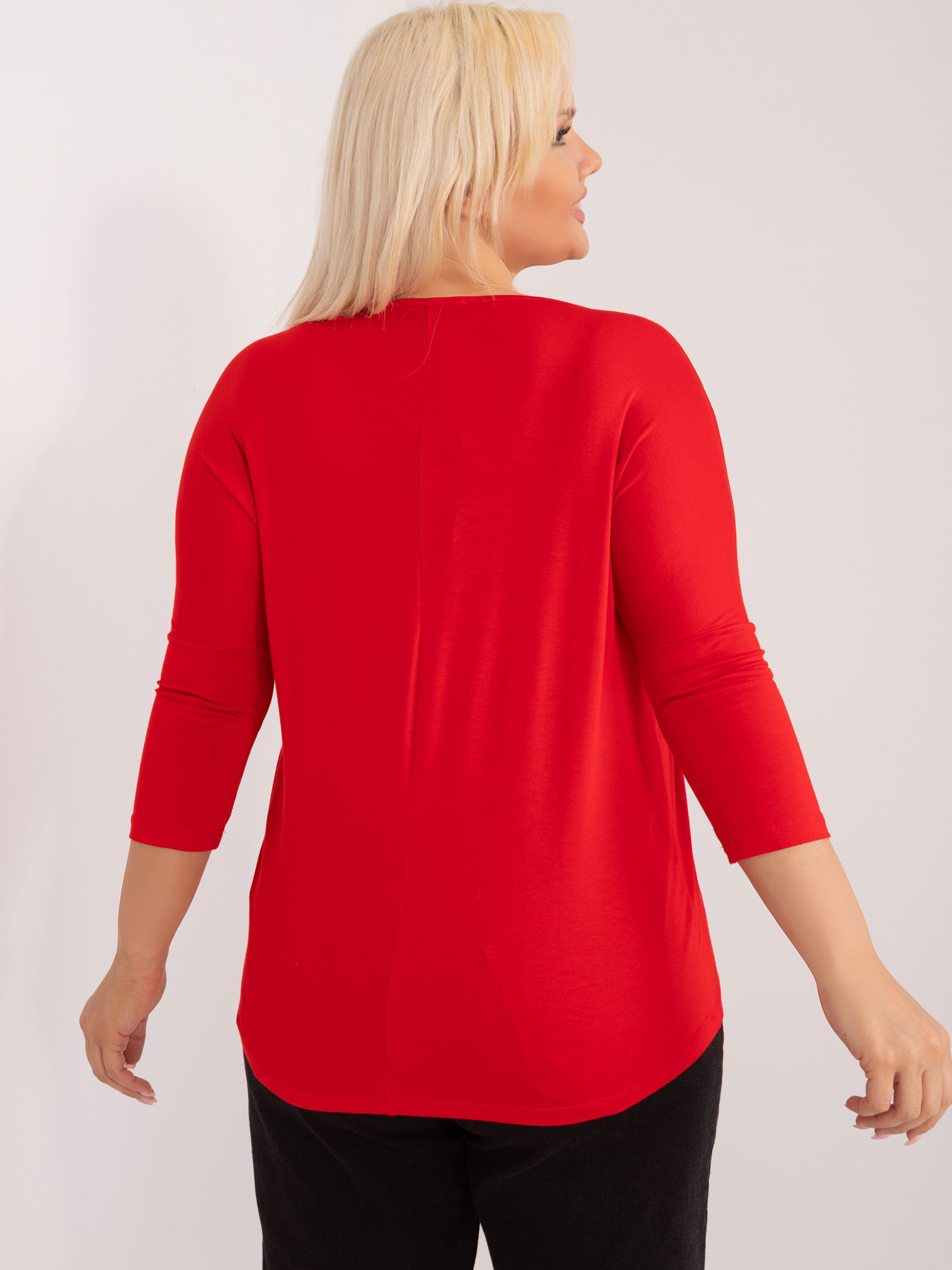 Czerwona bluzka plus size z wiskozy to idealny wybór dla kobiet, które chcą dobrze wyglądać i czuć się komfortowo. Bluzka wykonana jest z miękkiej, przyjemnej w dotyku wiskozy, która pięknie układa się na sylwetce i zapewnia komfort noszenia przez cały dzień. Klasyczny, lekko luźny fason delikatnie podkreśla figurę, nie krępując ruchów. Dekolt w kształcie litery V ozdobiony subtelnymi skrzyżowanymi paseczkami dodaje całości zmysłowego charakteru i przyciąga wzrok. Rękawy o długości 3/4 sprawiają, że model jest uniwersalny – idealny zarówno na co dzień, jak i na wyjście.