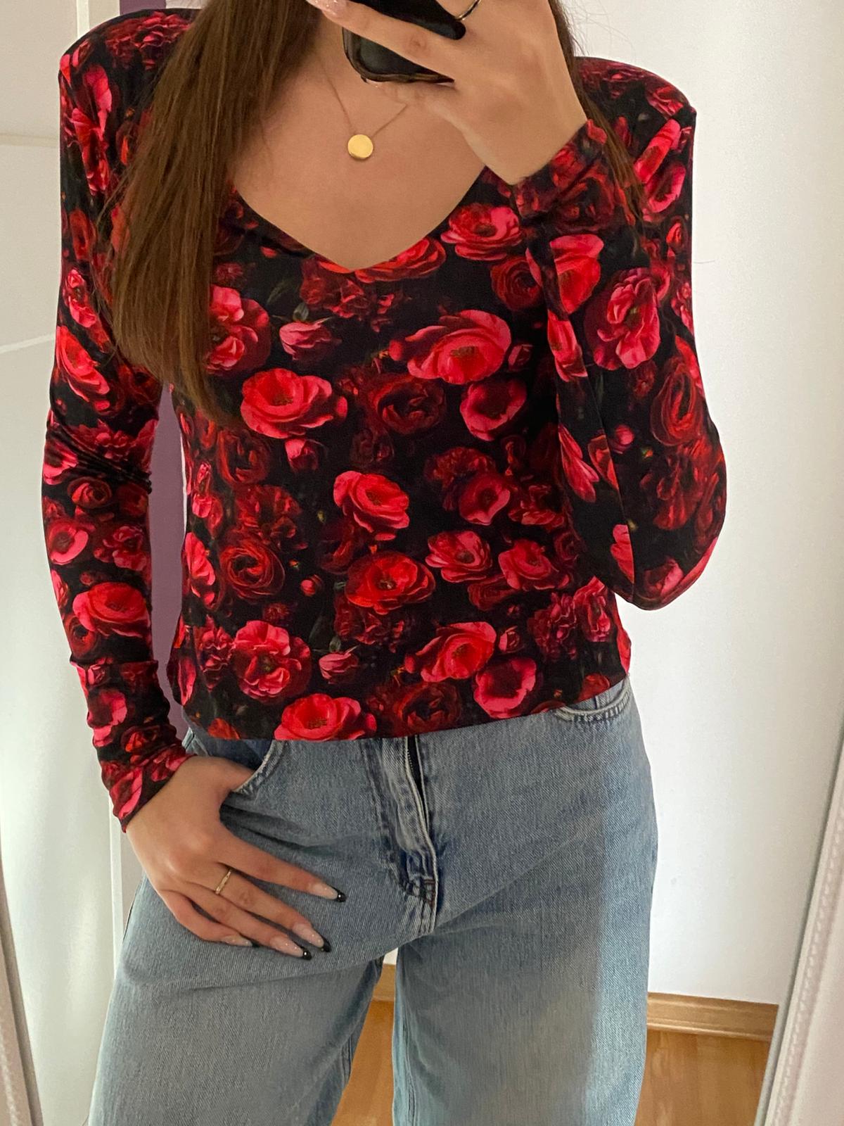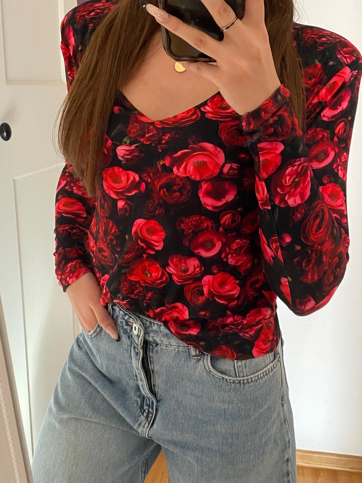 Model ma długi rękaw oraz dekolt w kształcie litery V, który subtelnie podkreśla linię szyi i dekoltu i wydłuża optycznie sylwetkę. Czarne tło zdobi efektowny kwiatowy wzór w odcieniach intensywnej czerwieni – motyw róż nadaje całości romantycznego, a jednocześnie wyrazistego stylu.