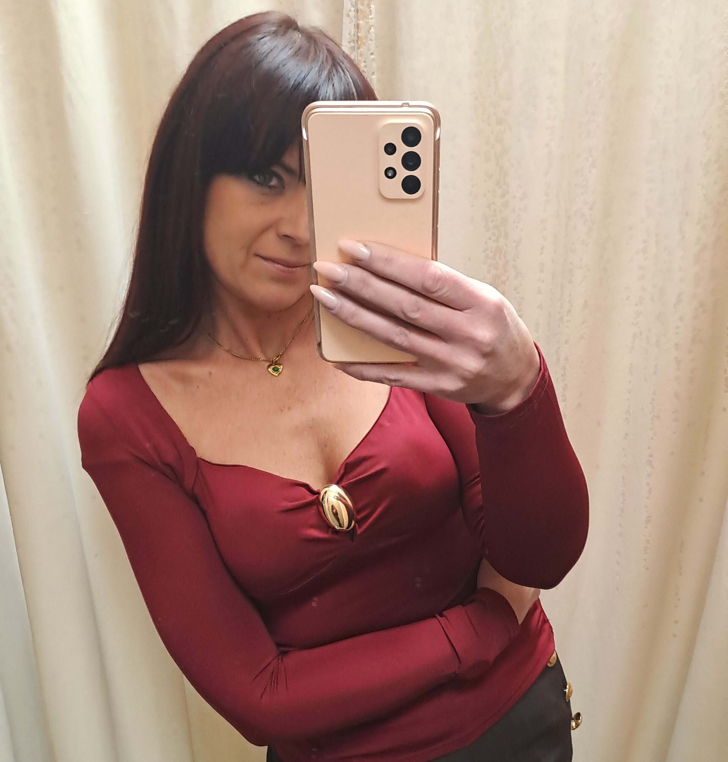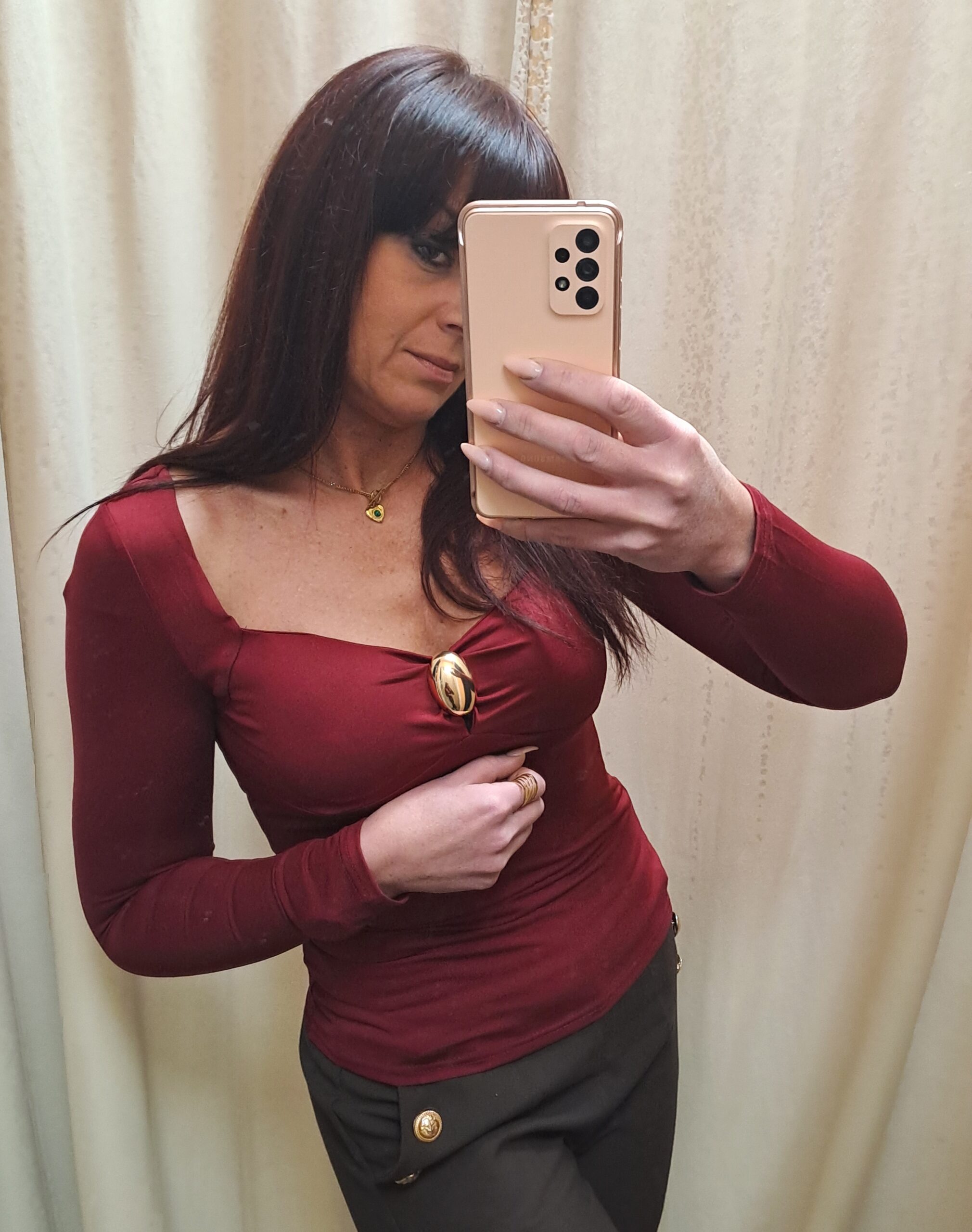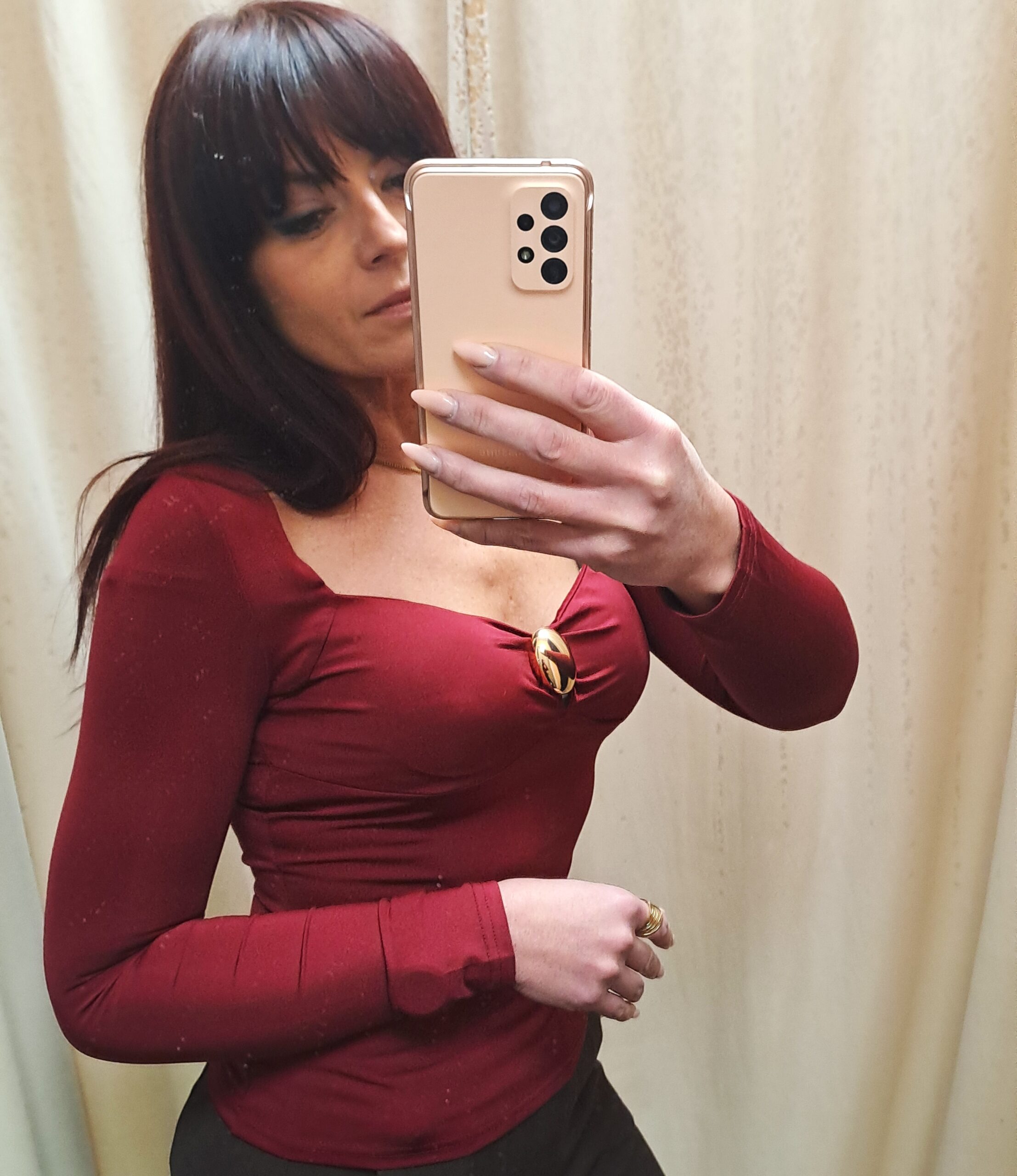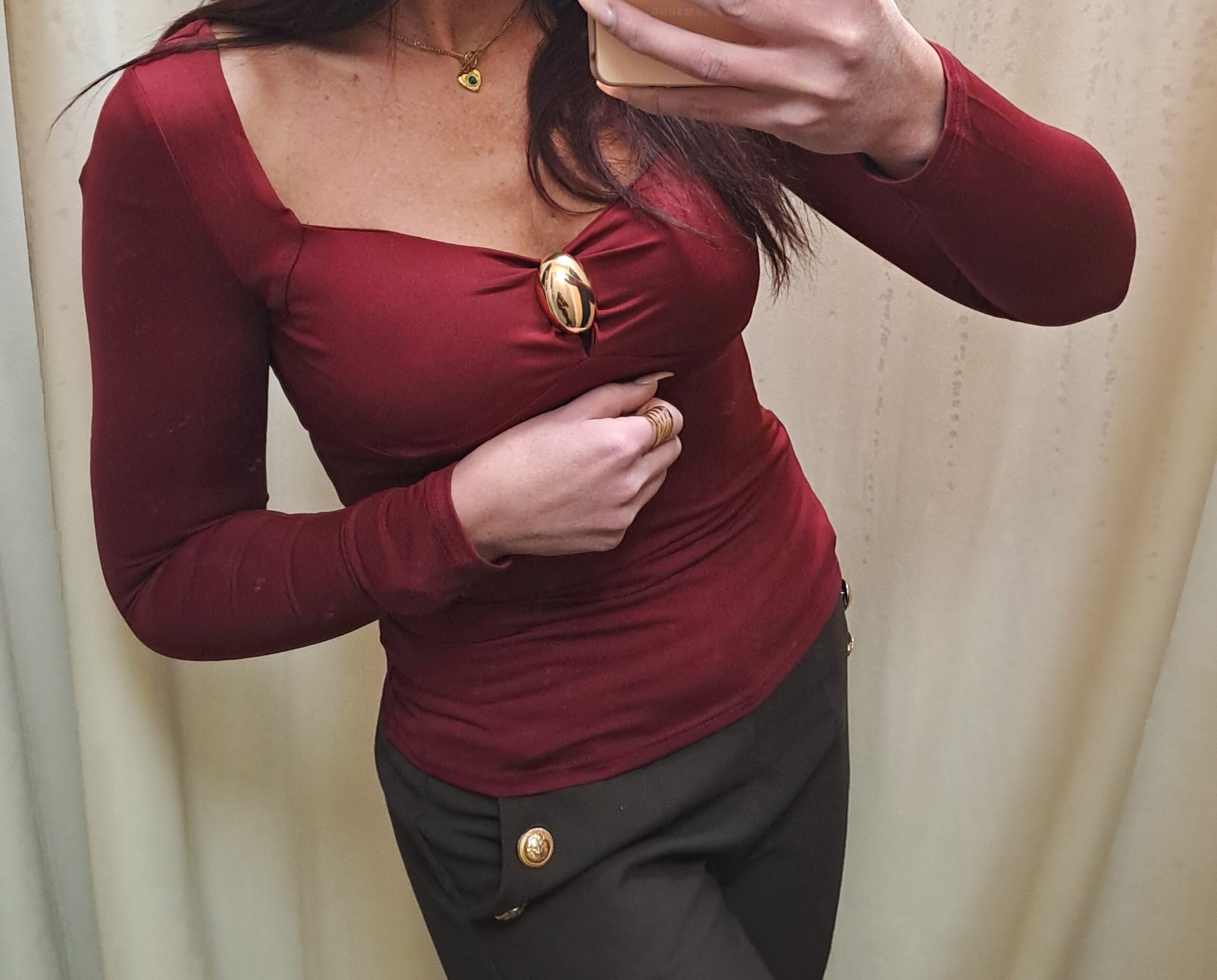 Bluzka z klamrą z wiskozy w odcieniu głębokiego bordo to elegancka propozycja, która podkreśla sylwetkę i dodaje stylizacji wyrafinowanego charakteru. Wykonana z miękkiego, przyjemnego w dotyku materiału, pięknie dopasowuje się do ciała i zapewnia komfort noszenia przez cały dzień.