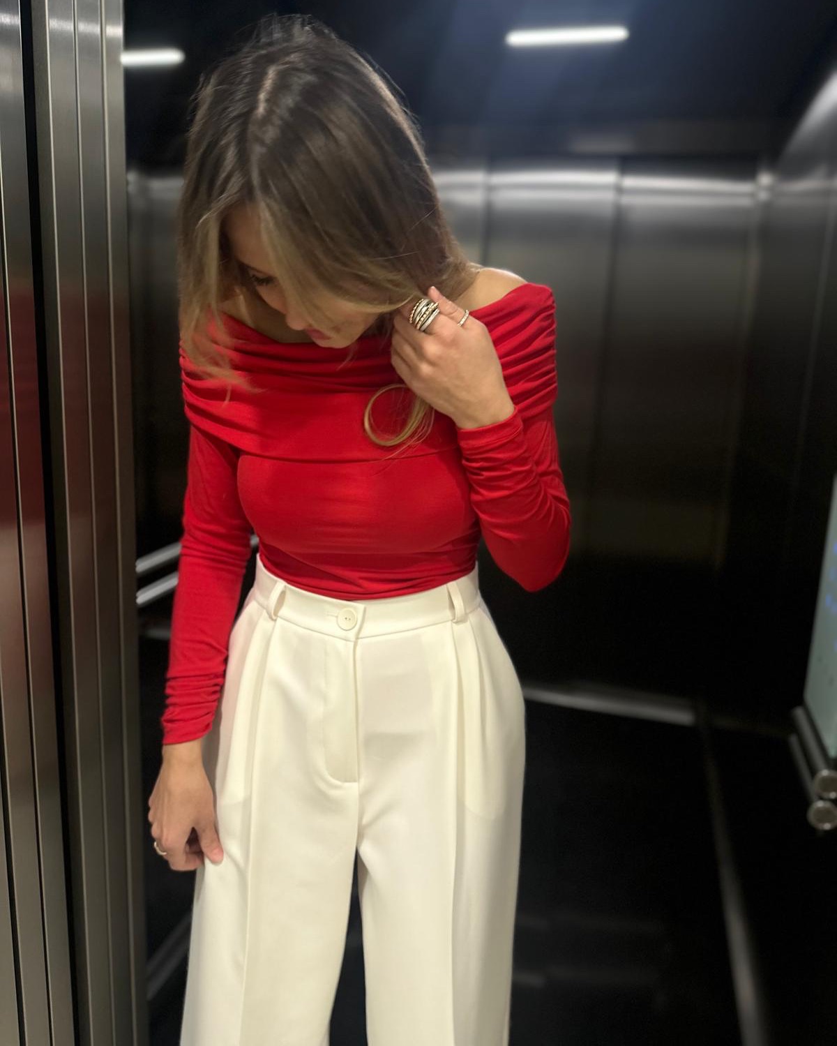 Body hiszpanka w rozmiarze XS w kolorze czerwonym marki BELLUCI to idealny wybór, jeśli chcesz wyglądać elegancko, ale z nutą zmysłowości. Odkryte ramiona pięknie eksponują sylwetkę, a dopasowany krój świetnie układa się zarówno do spodni z wysokim stanem, jak i spódnic. U góry bluzki jest gumka ,która idealnie dopasowuje się do linii ramion.Drapowania w górnej części nadają całości elegancki charakter i nutę romantyzmu. Na końcu rękawów drapowanie po jednej stronie.