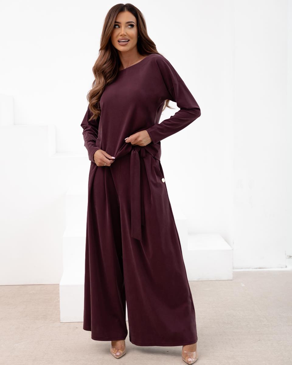 Niesamowity komplet Colori w kolorze ciemnego bordo, składający się ze spodni palazzo oraz bluzki z długim rękawem. Spodnie mają zakładki oraz gumkę na tylnej części dzięki czemu pięknie układają się w ruchu. Po bokach kieszenie.