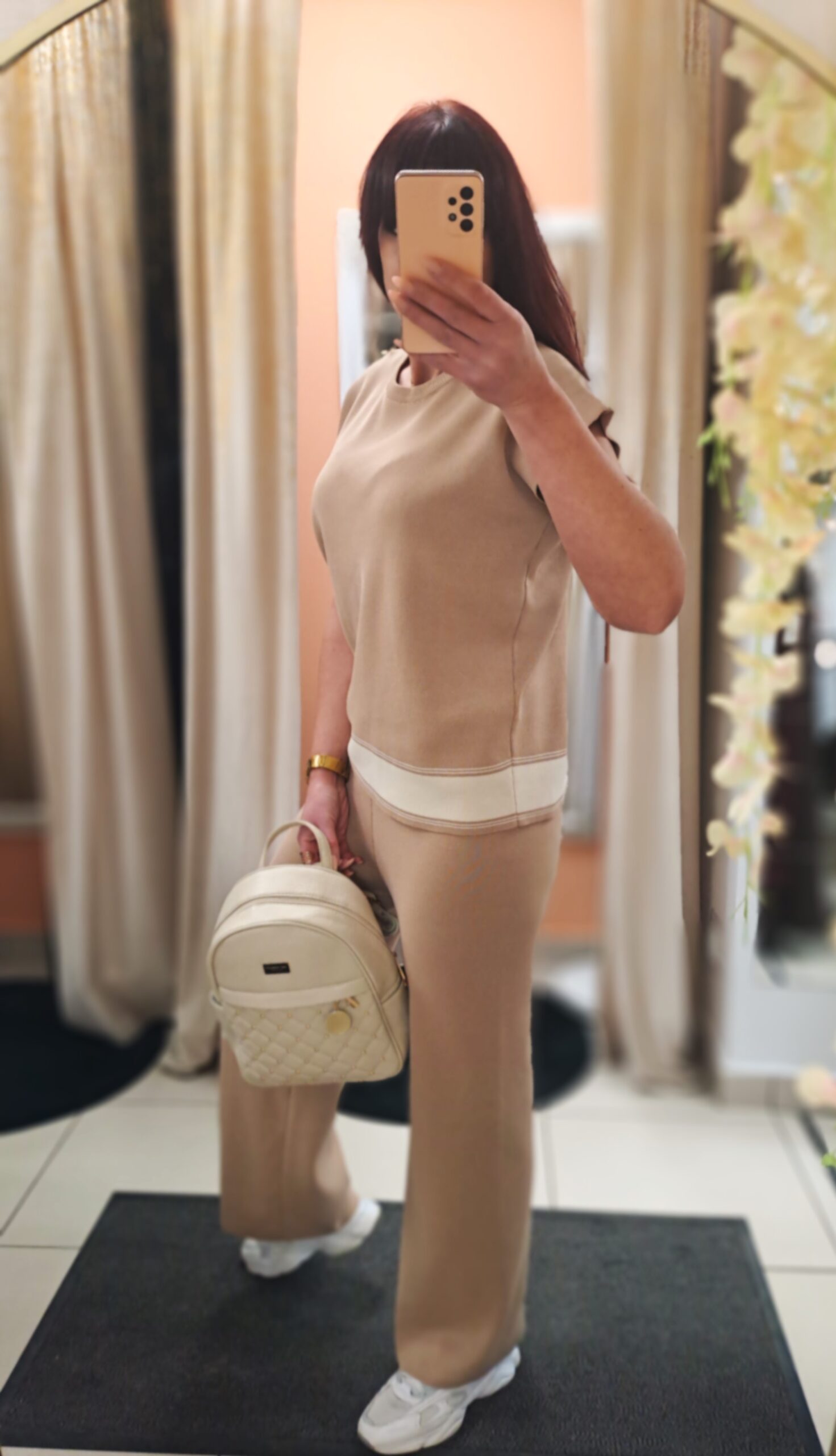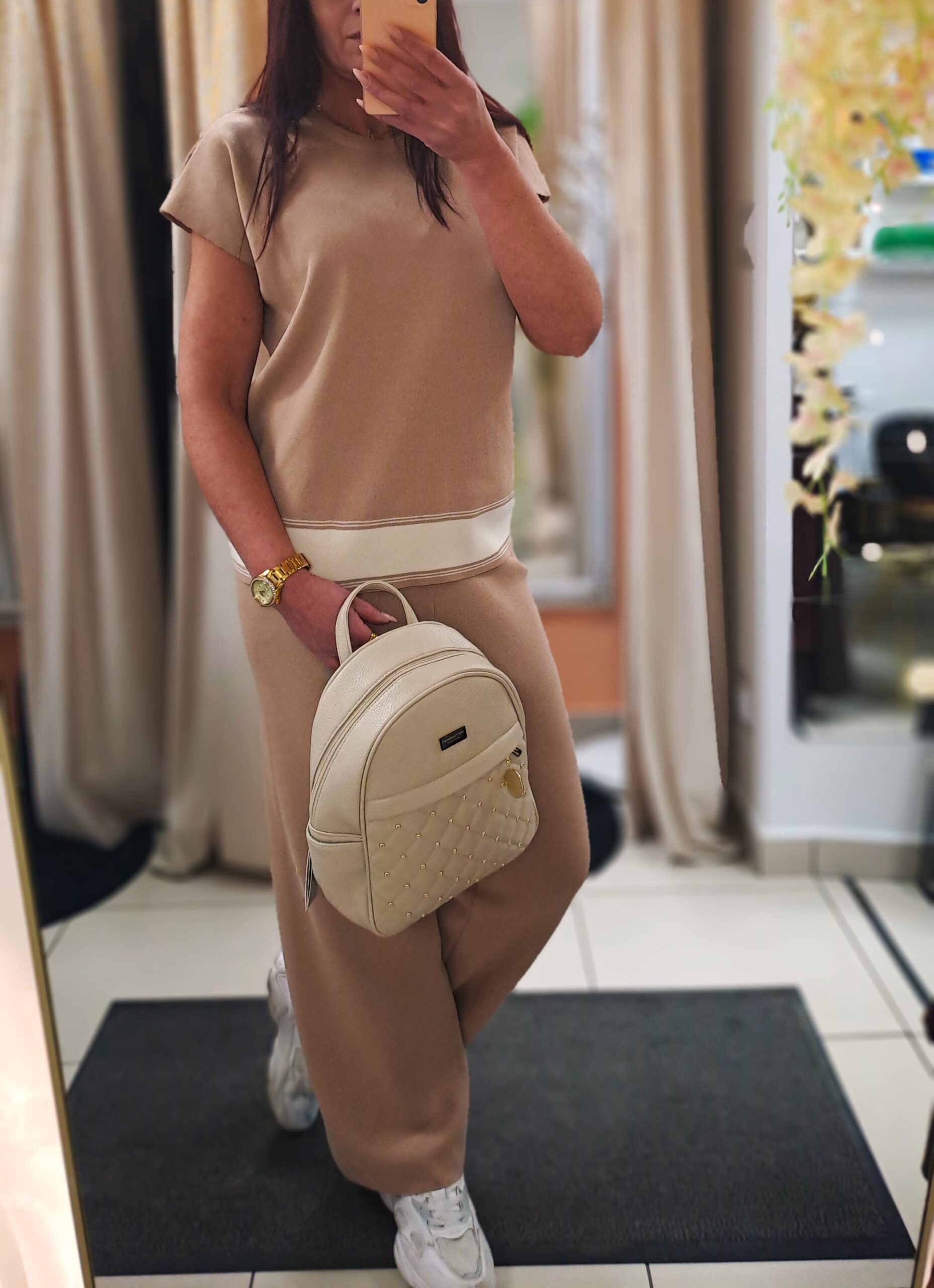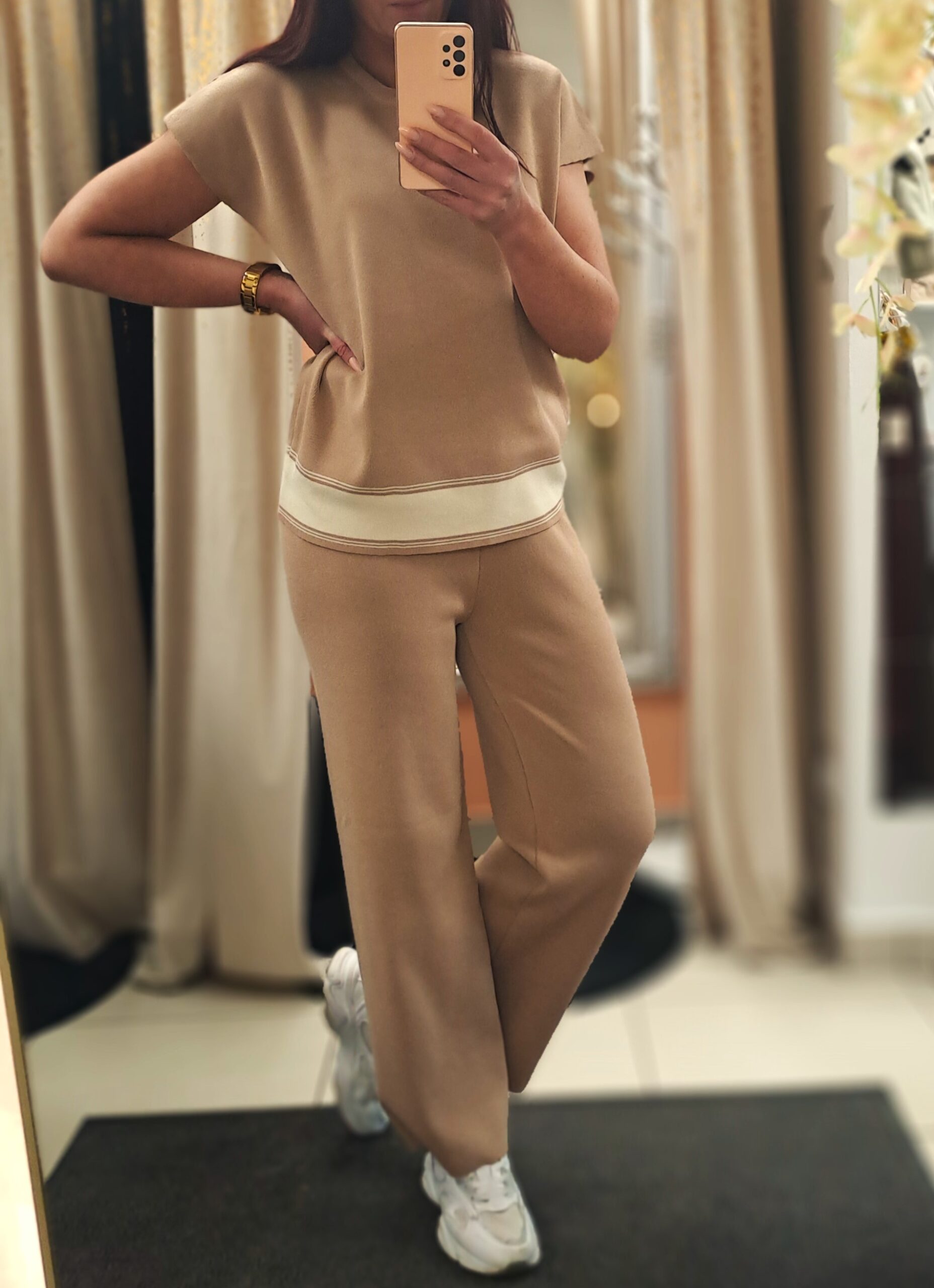 Elegancki i niezwykle komfortowy komplet dzianinowy wykonany z wysokiej jakości przędzy z 58% zawartością wiskozy, która zapewnia miękkość, przewiewność i przyjemne uczucie na skórze. Zestaw składa się z luźnej bluzki o prostym kroju z krótkim rękawem oraz wygodnych spodni o klasycznej, lekko rozszerzanej nogawce. Delikatne kontrastowe wykończenie przy dole bluzki dodaje całości nowoczesnego, subtelnego charakteru.