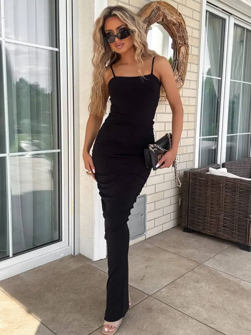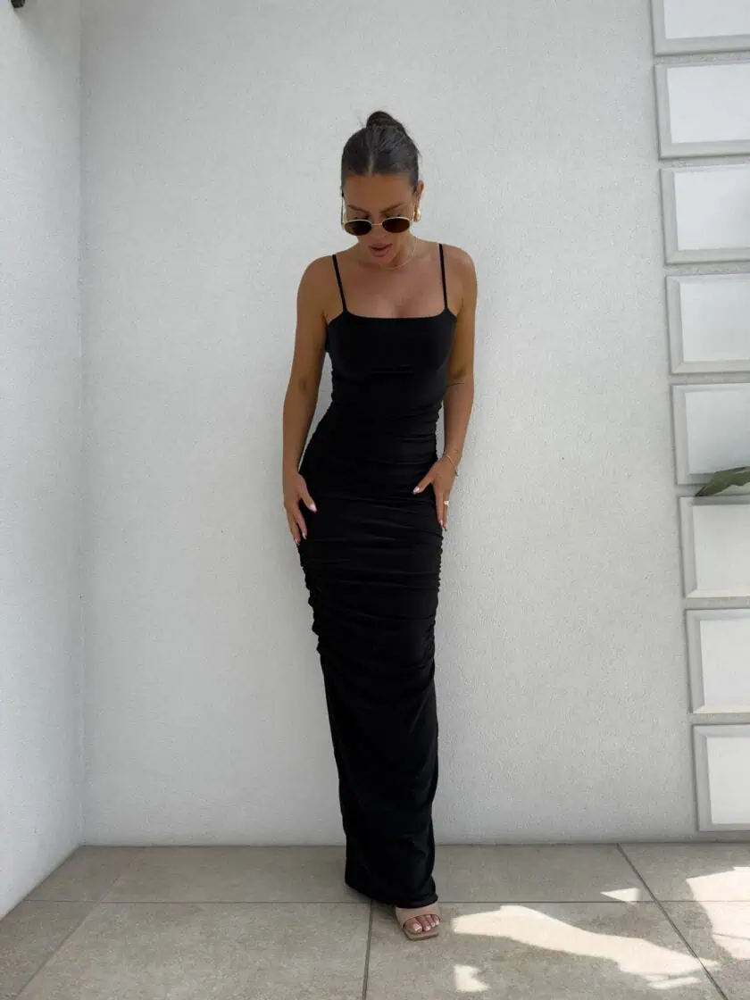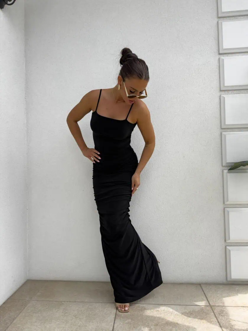 Długość maxi z efektownym rozcięciem z tyłu zapewnia swobodę ruchów oraz dodaje subtelnej zmysłowości. Cienkie ramiączka i minimalistyczny fason sprawiają, że sukienka prezentuje się nowocześnie i bardzo stylowo. Dekoracyjne marszczenia nadają całości wyjątkowego charakteru oraz tworzą zjawiskowy efekt wizualny.